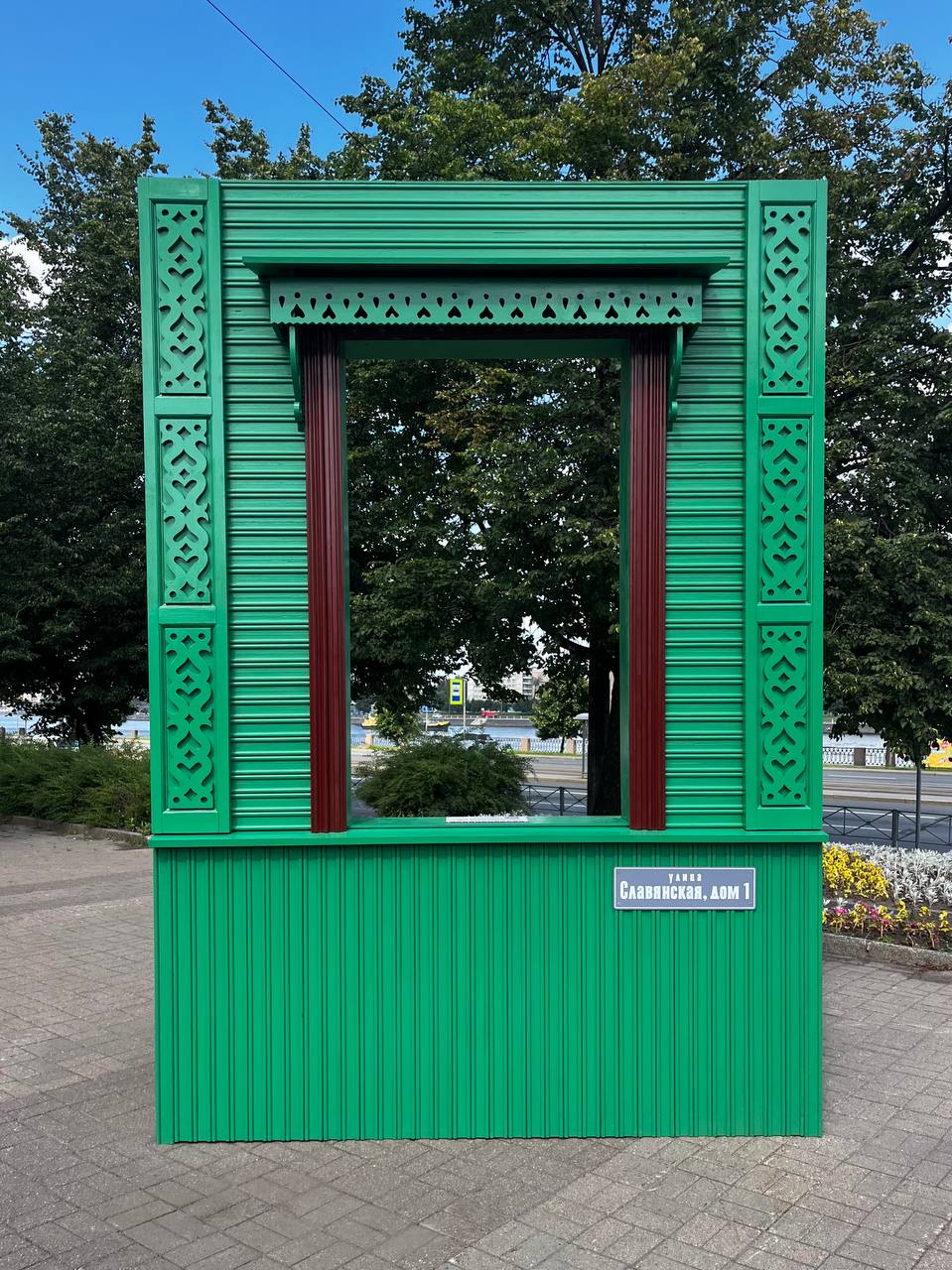 У главного входа на стилобате здания администрации Невского района появился стенд в виде художественной копии окна дома Слепушкина, расположенного в Усть-Славянке.