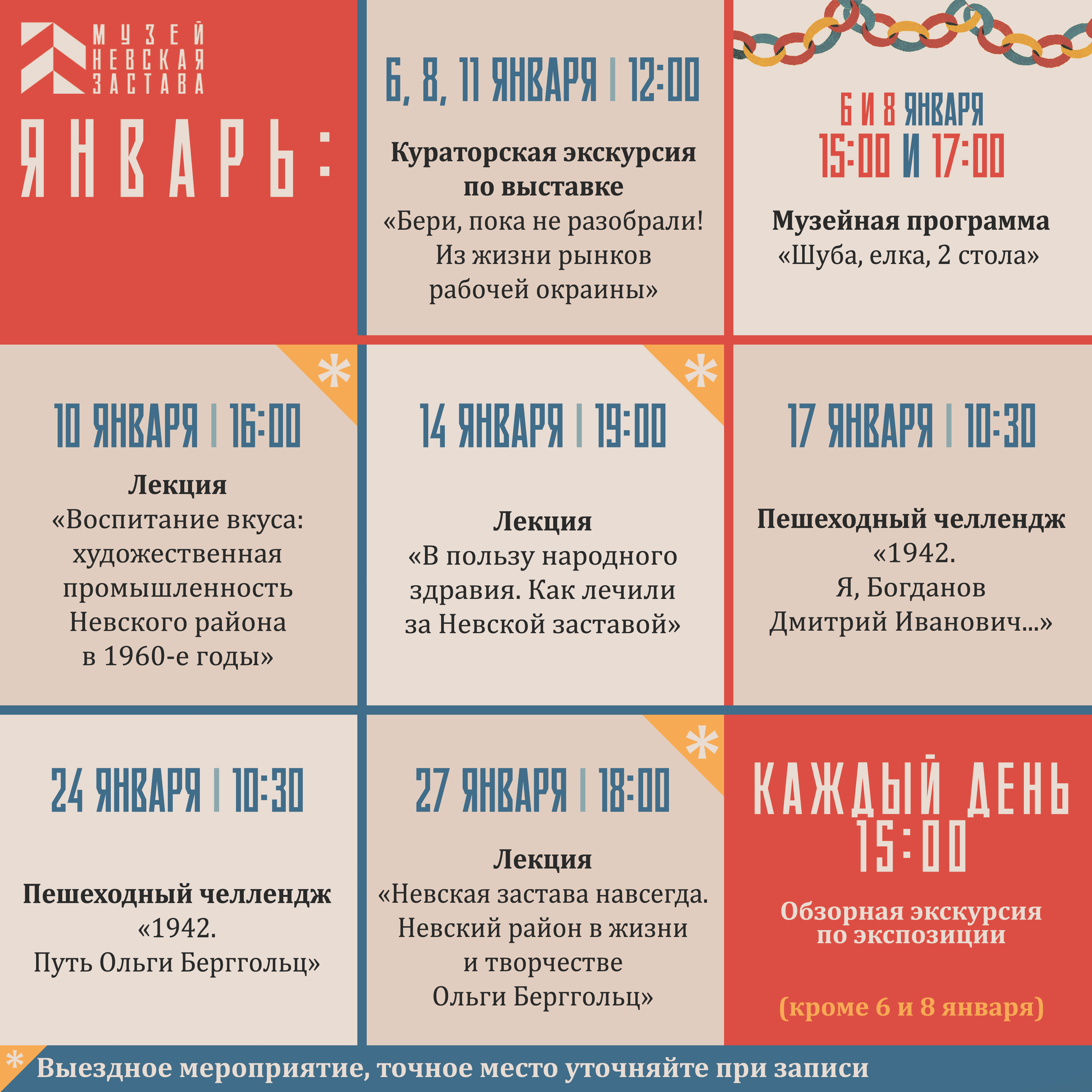 Каждый рабочий день, кроме 6 и 8 января, в 15:00 обзорная экскурсия по экспозиции